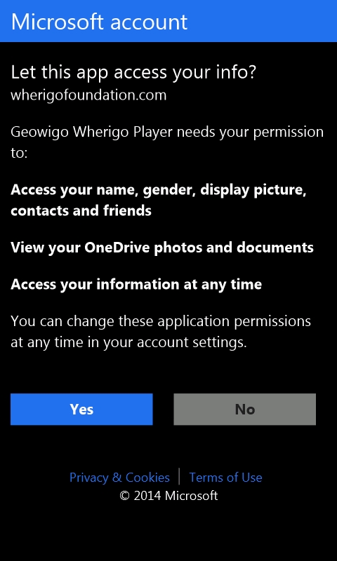 Kun ohjelma on saatu asennettua, pitää sinne hankkia kasetteja, jotta pääsee sukeltamaan Wherigojen maailmaan. Geowigo käyttää OneDrivea (ent. SkyDrive) kasettien säilytyspaikkana. Tämä tarkoittaa sitä, että Geowigolle pitää antaa lupa käyttää OneDrive pilvitallennustilaasi. OneDrive tunnettiin ennen SkyDrivena ja jos sinulla on Windows 8 tai Windows puhelin, niin sinulla on myös OneDrive -tunnus, koska OneDrive -palveluun kirjaudutaan samalla Live ID:llä kuin Windows 8:in tai puhelimeen.
