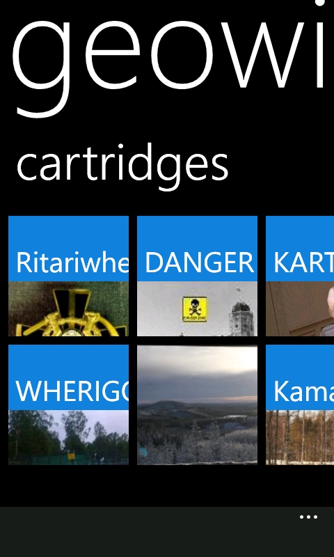 Navigointi Geowigossa on toteutettu kuten muissakin Windows Phone ohjelmissa. Päätasolla on kaksi välilehteä: Cartridges ja Recent. Cartridges välilehdellä on näkyvissä kaikki OneDrivestä synkronoidut kasetit. Recent -välilehdeltä löytyy viimeksi pelatut kasetit. Recent -listan saa tyhjennettyä valikosta. Minulle Recent -lista tuntui hieman turhalta, koska en pidä montaa kasettia OneDrivessa vaan poistan kasetit sitä mukaa kun ne olen suorittanut. Mutta mikäli haluaa säilöä monia kasetteja puhelimessaan, niin toiminto voi olla hyödyllinen.