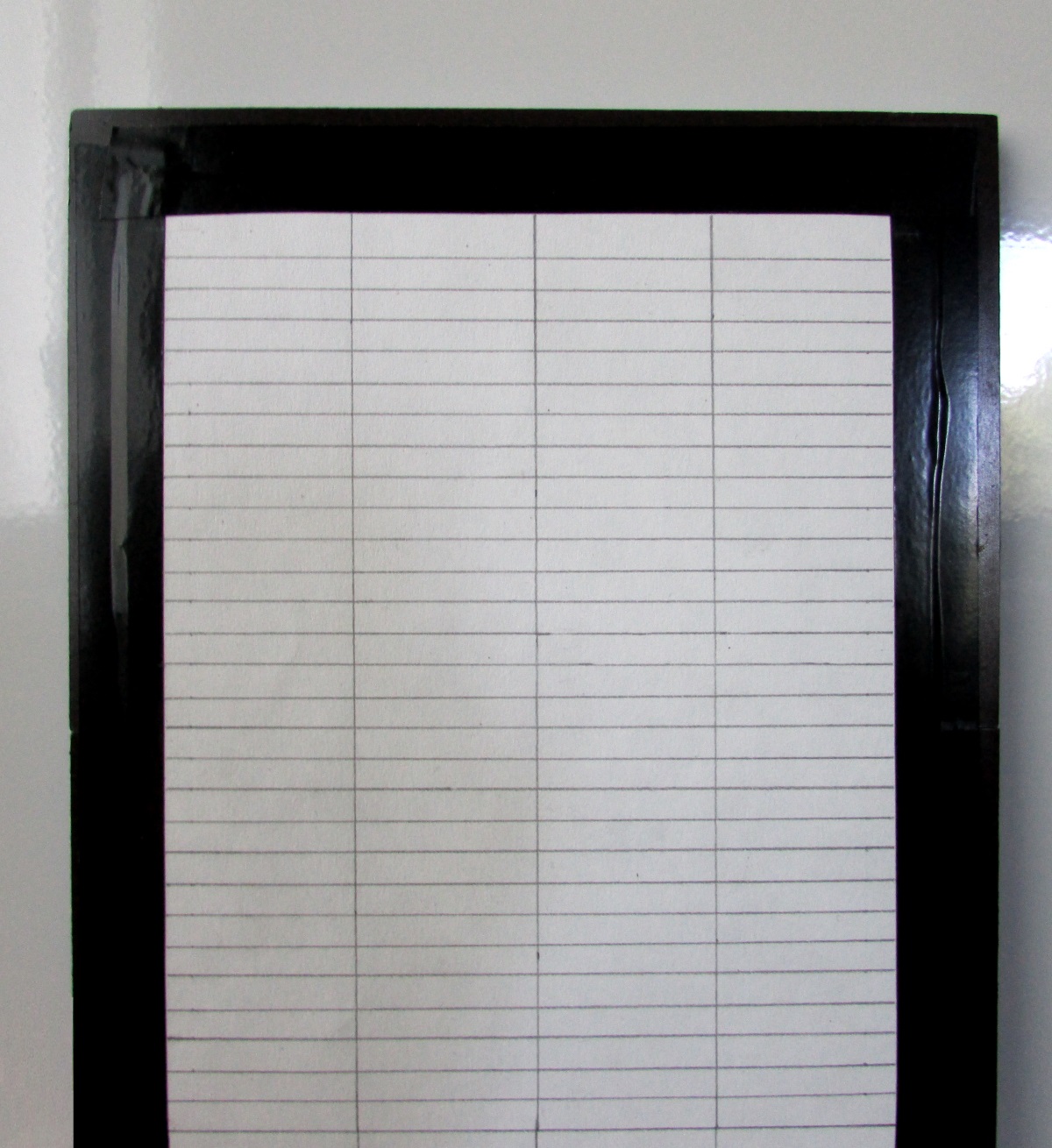 Nyt purkki onkin viimeistelyä vaille valmis. Päätin peittää kyltin ruuvinpaikat – aivan oikein – ruuveilla. Katkaisin muutaman ruuvin rautasahalla ja liimasin ruuvien kannat kylttiin, jotta kyltti näyttäisi siltä, että se on oikeasti ruuvattu paikoilleen (kuva 9). Liimaamisen käytin kosteudenkestävää Erikeepperiä, mutta toki muukin ulkokäyttöön tarkoitettu liima sopisi hommaan vallan hyvin. Itse asiassa Erikeeper ei ole ollenkaan paras vaihtoehto, mutta halusin nähdä, miten tuo kosteudenkestävä versio Erikeeperistä oikeasti kestää ulkona. Lisäksi se kuivuu läpinäkyväksi, joten pienet pursuamiset kannan alta eivät haittaa niin paljon. Lopuksi vielä piirsin lyijykynällä logipaperiin viivastot ohjaamaan vieraita kirjoittamaan nimensä logipaperia säästäen (kuva 10). Nyt purkki onkin valmis piilotettavaksi tai kiinnitettäväksi jääkaapin oveen (kuva 11).