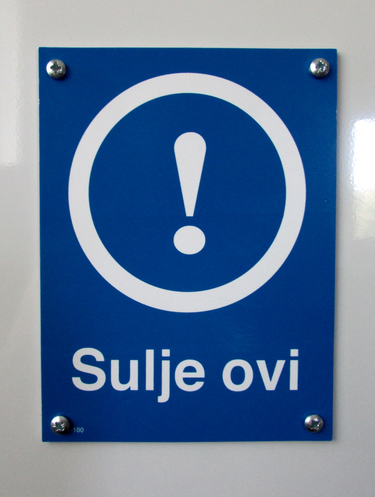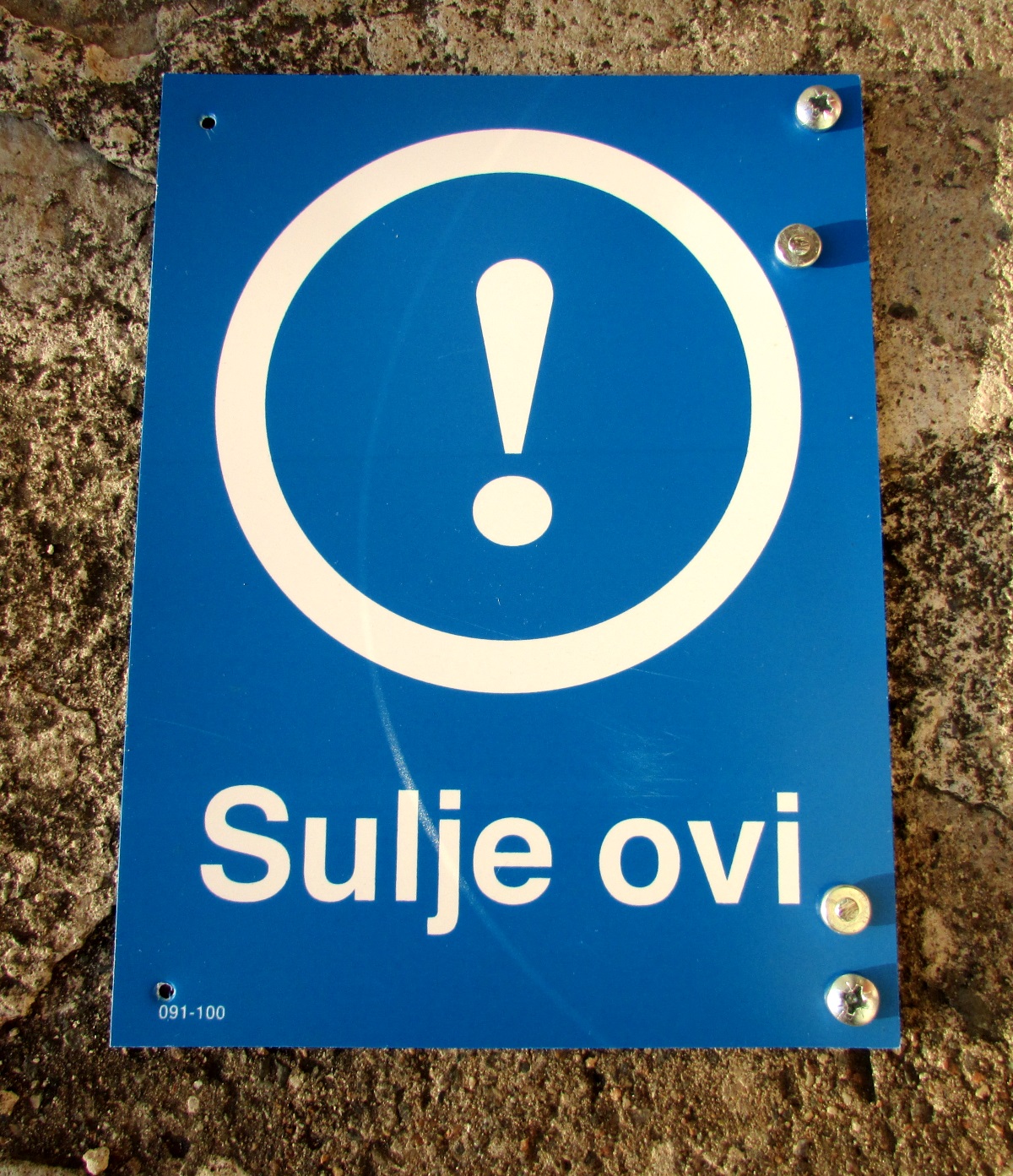 Rautakaupassa käydessäni huomasin tarjouskorissa kasan erilaisia varoitus- ja huomiokilpiä. Tulipa heti mieleen tehdä kilvestä kätkö, koska taannoin itä-Suomen reissulla oli tullut sellainen vastaan. Valitsin kilvistä tekstiltään sopivimman mukaani, kun ei ehkä ole asianmukaista kiinnitellä satunnaisiin paikkoihin varoituskilpiä, jos oikeasti ei ole mitään varoitettavaa. Niinpä mukaani tarttui tarralla kiinnitettävä “Sulje ovi” – kyltti (kuva 1). Ajattelin, että tuon voisi sijoittaa johonkin sopivaan paikkaan, jossa on ovi, esim. telemastolle. Päätin myös jakaa kokemukseni kätkön tekemisestä täällä blogissa.