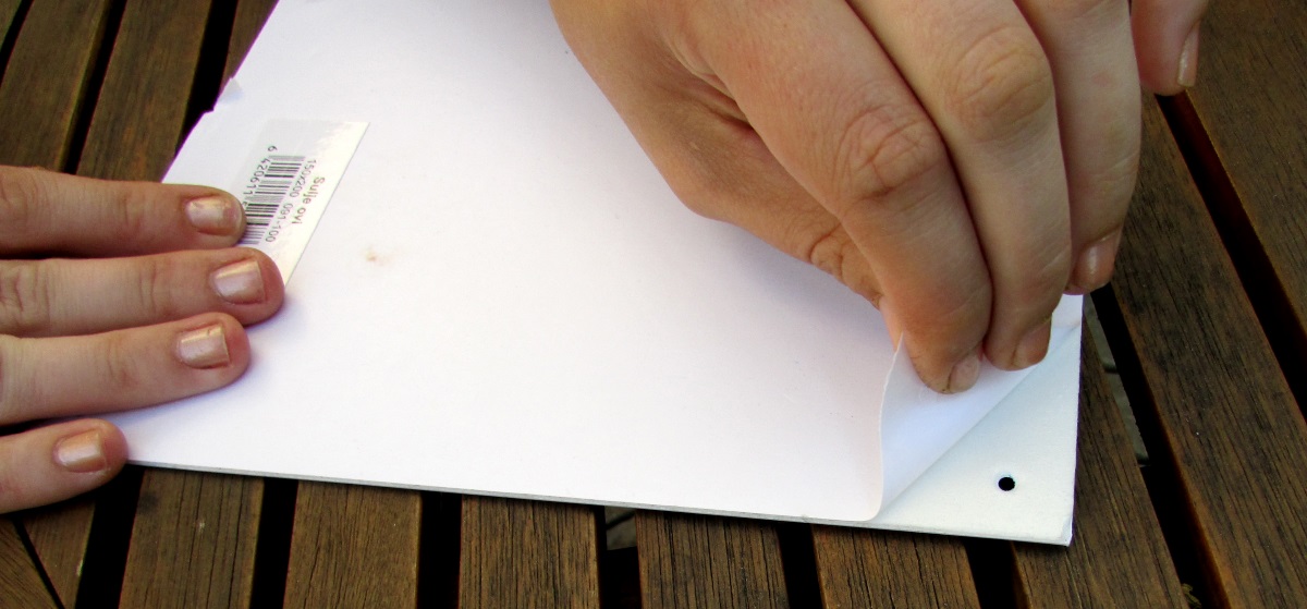 Valitsemani kyltti oli juuri kahden A5 levyn kokoinen, joten irrotin kyltistä ja magneettilevyistä suojakalvot ja kiinnitin liimapinnat vasten toisiaan (kuvat 3-5). Näin magneettilevyn magneettinen puoli tulee ulospäin eli seinää vasten.