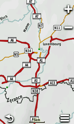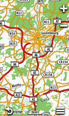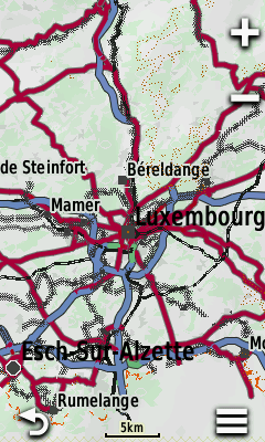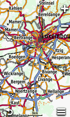 Alla kuvia molemmista kartoista helpottamaan valintaa siitä, kummat lataa omaan käyttöönsä. Kuvat on suurinpiirteina samalta kohdasta karttaa. Etenkin kauemmissa zoomaustasoissa (5km ja 3km), Open MTB on hieman sekavamman näköinen. Garmin OSM -kartat ovat selkeämmät, koska niissä on vähemmän näkyvissä kerralla. Toisaalta MTB -kartoissa näkyvät esimerkiksi katujen yksisuuntaisuudet, jotka ovat joskus tarpeen autoillessa. Tietysti voi ladata molemmat kartat ja vaihdella niiden välillä maastossa.