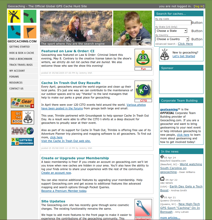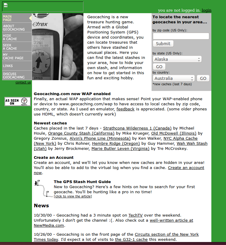 Toukokuu oli ja meni, mutta historiakatsaus ei vielä päässyt ihan maaliin asti. Niinpä jatkan kirjoittamista aiheesta vielä. Yksi tärkeä osa tämän päivän kätköilyä on tietenkin geocaching.com -palvelu, josta kätkökuvaukset löytyvät. Alkuaikoina kätköt julkaistiin uutisryhmässä, mutta pian Mike Teague alkoi ylläpitää sivustoa, johon hän keräsi kätköjen tiedot, kuten aiemmassa historiablogauksessa kirjoitin.