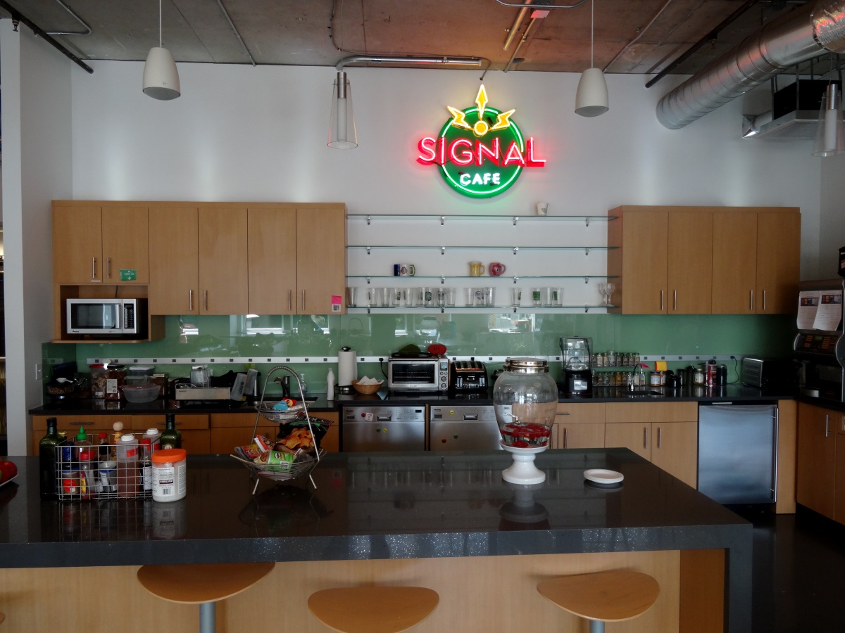 Me pääsimme kiertämään myös itse päämajan toimistotiloissa ja vaihtamaan muutaman sanan usean työntekijän kanssa. Toimisto on avokonttorityyppinen ja kiertää aulatilan ympärillä. Geocaching HQ:ssa työskentelee noin 80 työntekijää. Geocaching HQ:ssa on useita eri osastoja kuten Geocaching.com:n kauppa, uusista tuotteista vastaavat, sivuston koodaajat, sivuston uudet ominaisuudet sekä luonnollisesti vapaaehtoistyöntekijöistä vastaavat. Työntekijöille on vapaa-ajanhuone, jossa voi pelata pingistä sekä Signal Cafe -kahvila, jossa työntekijät voivat syödä ilmaiseksi. Työympäristö oli ainakin meidän silmään inspiroiva ja selkeästi Geocaching.com:n perustajat Jeremy ja Bryan pitävät huolta, että työntekijät viihtyvät työpaikallaan.