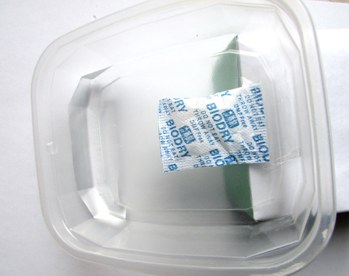 Testiin valikoitui kolme erilaista silikapussia: Tavallinen pieni silikapussi (kuvassa 6 vasemmalla) ja hieman isompi vihreätekstinen silikapussi (kuva 6 oikealla. Lisäksi vertailuun otimme mukaan Biodry -nimistä ainetta sisältävän kuivainpussin (kuva 5). Sitä, onko tuolla Biodry:lla suurta eroa silikaan, ei ole tiedossamme.