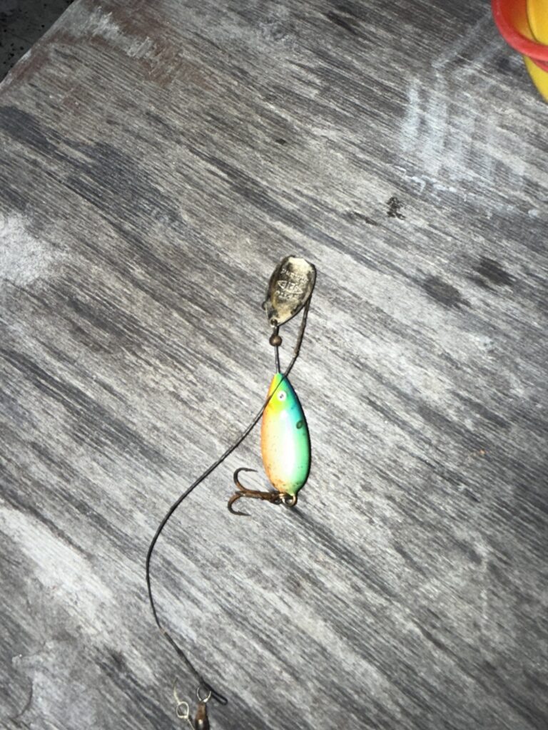 Päätimme lähteä katsomaan nappaisiko Olli paremmin kuin Teuvo. Siinä missä Teuvo oli lähellä rantaa ja uitavissa rannasta, niin Olli oli sitten kauempana. Täällä pohja oli selkeästi kivikkoisempi ja magneetti äkkiä tarttui kivenkoloon ja sitä sai irrotella. Hetki ongittiin ja sitten jotain nappasi magneettiin. Tunnelma veneessä nousi mutta voih. Kun magneetti tuli pinnalle oli siihen tarttunut pohjaan joltakin jäänyt uistin. CITOsimme tämän toki pois järvestä, mutta mieluusti olisimme myös kätkön napanneet. Kun kätköä ei hyvästä yrityksestä huolimatta löytynyt, päätimme heittää oikean uistimen veteen ja siirtyä kalastamaan toisella tapaa. Mutta Teuvolle ja Ollille palaisimme vielä.