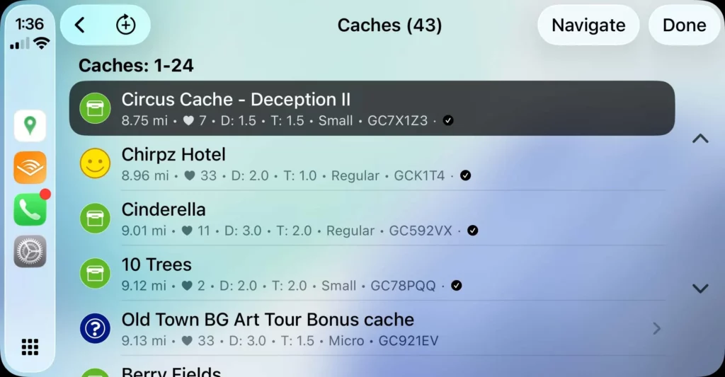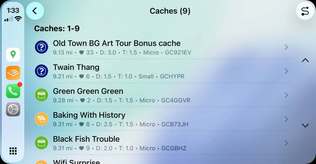 Yhteensopivilla näytöillä kartta tukee myös eleohjausta, kuten nipistyszoomausta ja kahden sormen kiertoa, joiden avulla aluetta voi tutkia luontevasti ajon pysähtyessä. Karttanäkymässä näkyvä kätkölaskuri kertoo, kuinka monta geokätköä on parhaillaan näkyvissä, ja painiketta napauttamalla avautuu selattava listanäkymä. Listalta löytyvät keskeiset tiedot, kuten etäisyys, vaikeus- ja maastoarvo, kätkön koko, suosikkipisteet sekä käyttäjän omat korostusvärit. Applen CarPlay-rajoitusten vuoksi kätköjä ei voi valita suoraan karttamerkeistä, vaan valinta tehdään tämän listan kautta.