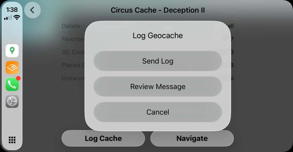 Päivitys tuo mukanaan myös mahdollisuuden logata kätköjä CarPlayn kautta. Cachly tukee CarPlayssa samoja lokipohjia, joita käyttäjä voi määrittää iOS-sovelluksessa. Lokipohjaan voidaan tallentaa esimerkiksi oma allekirjoitus tai vakioteksti, ja CarPlayssa saneltu ääniviesti yhdistetään automaattisesti tähän pohjaan. Halutessaan käyttäjä voi myös ohittaa puheohjauksen kokonaan ja lähettää lokin pelkällä pohjatekstillä muutamalla painalluksella. Sinänsä loggauksen sanelussa ei ole uutta, mutta koska sanelu tapahtuu auton äänijärjestelmän kautta voi sanelun suorittaa kätevästi samalla, kun ajelee kohti seuraavaa kätköä. Jos internet yhteyttä ei ole saatavilla sanellut loggaukset tallentuvat puhelimeen drafteina, jotka voi myöhemmin lähettää geocaching.comiin.