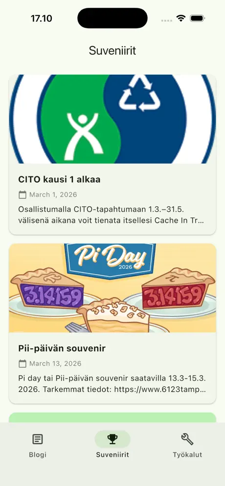 Sovelluksesta löytyy blogista tuttu souvenir-kalenteri, josta näet helposti tulevat souvenirit ja niiden ajankohdat. Souvenirin saat kätevästi sovelluksesta lisättyä myös omaan kalenteriisi, jos et ole halunnut lisätä 6123tampere.com blogin kalenteria kalenterisovellukseesi. Souvenir-kalenterista pääseet myös souveniria käsittelevään lisätietoja tarjoavaan blogijuttuun käsiksi, mikäli sellainen on julkaistu.