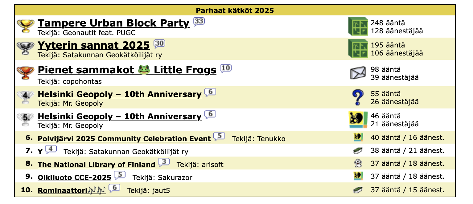 Geocache.fi:ssä on ollut jälleen kerran käynnissä viimeiset pari viikkoa Suomen parhaan kätkön äänestys. Suuret kiitokset jälleen kerran haksu10:lle äänestyksen järjestämisestä. Äänestyksessä kätköilijät voivat äänestä mielestään vuoden 2025 parasta kätköä tai… Continue reading Suomen parhaat kätköt 2025